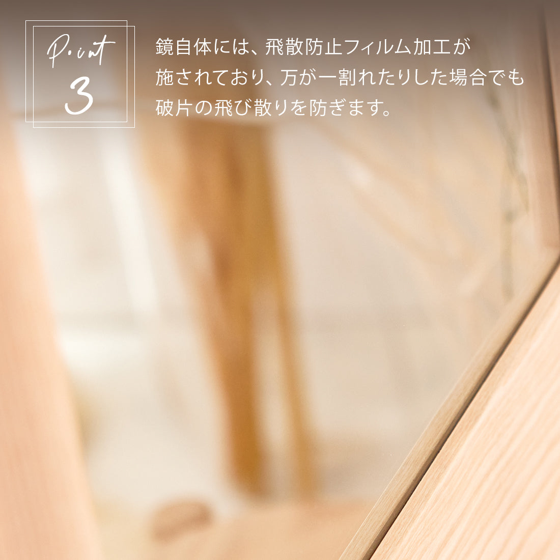 ・鏡自体には飛散防止フィルム加工が施されているので万が一の時でも安心。
