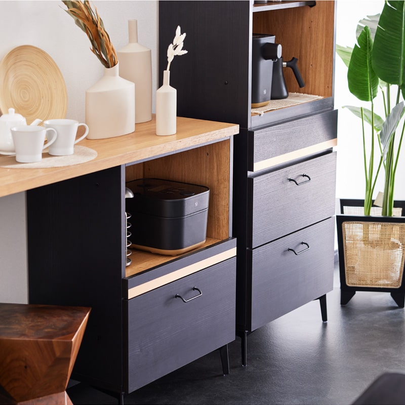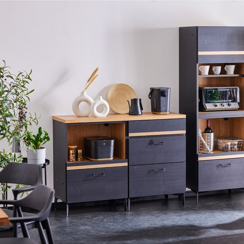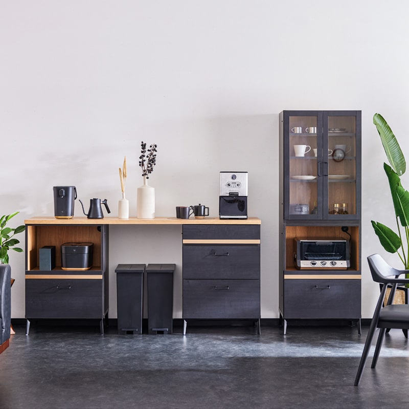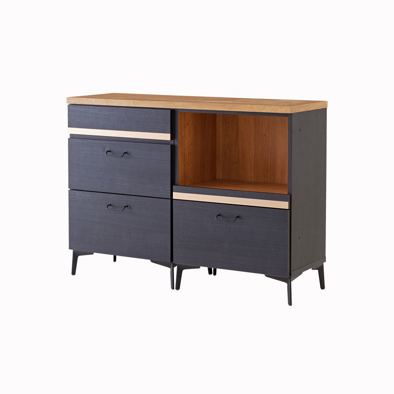 キッチンカウンター キッチン収納 食器棚 カップボード キッチン 収納 収納棚 レンジ台 レンジボード キャビネット 作業台 ロータイプ スリム 120cm 120 幅120 木製 引き出し スライド棚 脚付き ブラック 黒 ゴールド モノトーン 国産 日本製 大川家具 半 完成品 おしゃれ モダン スタイリッシュ 北欧 シンプル